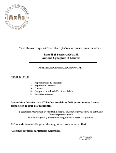 ASSEMBLEE GENERALE du CLUB ATTENTION Le SAMEDI 28 FEVRIER 2026 les COURS auront lieu de 14 à 15h AVANT L’ASSEMBLEE GENERALE REPRISE SUR L’AVIS CI-DESSUS